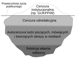 | Autocenzura | Dziennikarz zdaje sobie sprawę, że materiały na tematy kontrowersyjne najprawdopodobniej nie zostaną wydrukowane. Dlatego też wybiera inne „bezpieczniejsze” tematy. Pomimo braku bezpośredniej ingerencji redakcji lub instytucji zachowanie takie wynika wprost z istnienia instytucji cenzurującej. |