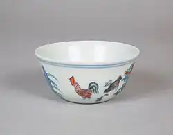 Chociaż pierwsze przykłady stosowanych naszkliwnie emalii pojawiły się w Cizhou już w czasach dynastii Jin (zobacz powyżej), to aż do ery Chenghua (1465–1487) rzadko używano pełnej palety dostępnych kolorów. Najdoskonalsze z tych z reguły niewielkich naczyń były wykonywane w technice doucai. Wpośród nich znajdują się tzw. „kurze czarki”, opatrzone dekoracją złożoną z kogutów, kur i kwiatów (zobacz ilustracja). Oprócz tego wykonywano również wyroby pokryte jedynie naszkliwnymi emaliami lub łączące ze sobą podszkliwny błękit z naszkliwną żelazną czerwienią[3]. Z ery Xuande (1426–1435) pochodzą pierwsze naczynia typu wucai („pięciokolorowe”, czyli polichromowane), charakteryzujące się szerszą paletą barw, obejmującą czerwień, żółć, zieleń, turkus i bakłażanowy błękit (aubergine). Dekoracja wucai była często dosyć rozbudowana – w XVI wieku naczynia zaczęto opatrywać scenami z popularnych dramatów, zaś z początkiem XVII wieku naczynia przeznaczone na rynek japoński dekorowano za pomocą bardzo udanych obrazów przedstawiających popularne motywy, takie jak uczeni wsiadający do łodzi, krajobrazy czy buddyjscy luohani[72][3]. Technika aplikowania wielokolorowych szkliw wprost na biskwit wywodzi się z tradycji ceramicznej epoki Tang. W epoce Ming była stosowana w tzw. ceramice fahua, która prawdopodobnie ma swój początek w kamionkowych naczyniach wytwarzanych w Junzhou w Henanie. Tę technikę udoskonalono w Jingdezhen i zastosowano ją do porcelany, przy czym dominowały kolory turkusowy, ciemnoniebieski i bakłażanowy (aubergine). Dekoracja była tworzona przez nakładanie warstw gliny na ciało i wycinanie detali, przy czym po wypaleniu nieszkliwionego ciała wzór był malowany na obrzeżach poszczególnych motywów, co pozwalało utrzymać odrębność poszczególnych kolorów podczas kolejnego wypalenia. Najlepsze naczynia zostały wykonane w XV wieku, przy czym dekoracja obejmuje ptaki na gałęziach, pawie w ogrodach, lwy chińskie, zaś nieco później również taoistów pośród krajobrazu[3][73].