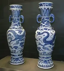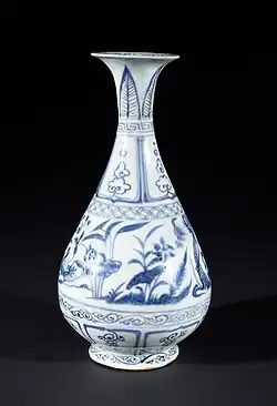 Po upadku Mongołów restrykcje handlowe nałożone przez cesarza Hongwu (1368–1398) spowodowały braki tlenku kobaltu zaś produkujące dotychczas głównie na eksport Jingdezhen musiało zaadaptować się do gustów lokalnych. Z powodu tylko częściowego wypalenia oraz kiepskich metod oczyszczania błękit kobaltowy na naczyniach z tego okresu jest szarawy i podobny kolor często przybiera również czerwień miedziowa, czasami wręcz znikająca w miejscach ulatniania się. Przejście z epoki Yuan do Ming w piecach Jingdezhen dokonało się w pełni za cesarza Yongle (1403–1424), kiedy niebiesko–biała porcelana, powstająca w warunkach pełnego dostępu do pochodzącego z importu tlenku kobaltu, osiągnęła dojrzałość[3]. To również na okres rządów Yongle datuje się początek zwyczaju opatrywania porcelany znakami wskazującymi na erę jej powstania[7].