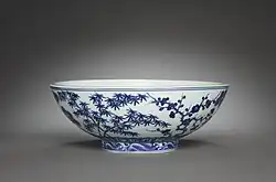 Jeszcze w 1388 podręcznik dla kolekcjonerów Gegu Yaolun opisywał niebiesko–białą porcelanę (wraz z pięciokolorową wucai) jako „niezwykle wulgarną”[66]. Jednak po wznowieniu kontaktów handlowych z krajami zamorskimi w erze Yongle jej produkcja dynamicznie się rozwijała, zaś za panowania Xuande po raz pierwszy niebiesko-białą porcelaną zainteresował się cesarski dwór i złożono duże zamówienia na potrzeby pałacu. Era Xuande, ze swoją wyrafinowaną dekoracją, często mającą źródło w tradycyjnym malarstwie, jest uważana za apogeum rozwoju niebiesko-białej porcelany. Po okresie tzw. ceramicznego interregnum, kiedy przez około trzydzieści lat piece w Jingdezhen były znacznie mniej aktywne, ówczesny styl był kontynuowany w erze Chenghua (1465–1487). Za panowania Zhengde (1506–1521) pojawił się znaczny popyt pośród muzułmańskich eunuchów na tzw. „wyroby muzułmańskie”, zawierające inskrypcje w językach perskim lub arabskim. Naczynia z czasów panowania cesarzy Jiajinga (1522–1566) i Wanli (1573–1620) wyróżniają się odejściem od dawnej dekoracji kwiatowej na rzecz scen o charakterze bardziej naturalistycznym (zobacz ilustracja misy ze sceną przedstawiającą bawiące się dzieci). Czasy Wanli to okres pogarszania się jakości ówczesnej porcelany, co wiąże się ze schyłkiem dynastii jako takiej. Najciekawsze naczynia pochodzą z pieców prywatnych, produkujących z reguły na eksport[58][3][67]. To wówczas powstaje tzw. ceramika Kraak, charakteryzująca się cienkim i kruchym czerepem, bladym i nierównym zabarwieniem oraz dekoracją podzieloną na odrębne panele ze sceną centralną w środku. Forma i dekoracja tych naczyń naśladuje ceramikę z Azji Południowo-Wschodniej, chociaż zaczyna być modyfikowana zgodnie z gustami nabywców europejskich[68][58]. Panowanie Tianqi (1621–1627) zaznaczyło się kruchą i gruboziarnistą niebiesko–białą porcelaną, znaną w Japonii jako tenkei, zaś oznakowane naczynia z czasów Chongzhena (1627–1644) są rzadkie i kiepskiej jakości[69].