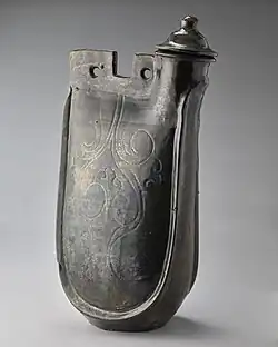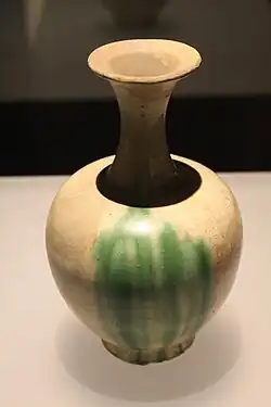 Ceramika produkowana pod rządami kitańskiej dynastii Liao (907–1125) kontynuowała tradycję białej i trójkolorowej ceramiki dynastii Tang, absorbując jednocześnie pewne wpływy pieców Ding i Cizhou (zobacz poniżej) działających za czasów Północnej Dynastii Song (960–1127)[12]. Pokrywana szkliwem ołowiowym ceramika wypalana w niskiej tempreraturze miała glazurę kremowo-białą, bursztynową lub zieloną, albo też złożoną z kombinacji tych kolorów w formie typowego Tangowskiego sancai. Kamionka była zazwyczaj szkliwona na biało. Ceramikę Liao wyróżniają oryginalne kształty, w sposób oczywisty odzwierciedlający specyficzne gusta i zwyczaje koczowników. Najbardziej charakterystyczną formą wytwarzanych naczyń jest butla pielgrzyma, której kształt jest wzorowany na skórzanym bukłaku na wino. Te naczynia zazwyczaj nazywane są „butlami z grzebieniem koguta”, ponieważ na górze posiadają zakrętkę, czasami kształtem przypominającą koguci grzebień (zobacz ilustracja). Wazy często posiadają ekstrawaganckie proporcje, z wysokimi, wyciągniętymi ciałami. Butle czasem mają parę zapętlonych uchwytów z każdej strony by trzymać się skórzanego pasa. Wśród dzbanów występują ekscentryczne formy takie jak okrągłe naczynia z pojedynczym horyzontalnym uchwytem przytwierdzonym do wlewu lub ciałem w formie papugi. Dekoracja jest oparta raczej na abstrakcyjnej, geometrycznej ornamentyce, niż typowych chińskich motywach[3].