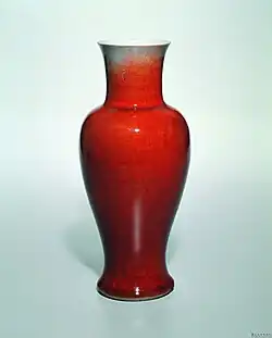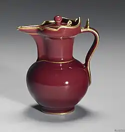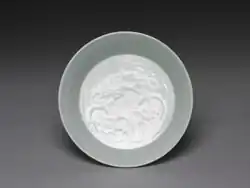 Rządzący Chinami Mongołowie preferowali jednak białą porcelanę, przy czym ta wytwarzana w Jingdezezhen nadal posiadała lekko niebieskawy ton, tak że mówiono o „bieli [skorupki] jajka”. Wiązało się to ze stworzeniem nowego białego szkliwa, ze zredukowaną zawartością popiołu drzewnego, co pozwalało uzyskać wyrazisty matowy odcień. Wśród tej porcelany wyróżniają się naczynia opatrzone znakiem shufu („Prywatna Rada”)[60][3] (zobacz ilustracja), będące prawdopodobnie pierwszą ceramiką zamówioną w Jingdezhen przez dwór cesarski[61]. Chociaż pierwsze naczynia pokryte czerwienią miedziową zostały wykonane już w epoce Tang w piecach Changsha to technika wykonywania dekoracji podszkliwnej w tym kolorze została opanowana dopiero w czasach dynastii Yuan. Była ona zasadniczo taka sama jak technika dekoracji w podszkliwnym błękicie – w obu przypadkach glina jest malowana barwiącym tlenkiem (odpowiednio kobaltu i miedzi) i przed wypaleniem pokrywana przezroczystym szkliwem. By uzyskać kolor czerwony tlenek miedzi wymaga jednak wyjątkowo stabilnej atmosfery wypalania i znamy niewiele udanych naczyń pochodzących z epoki Yuan. Dzban należący do skarbu odnalezionego w pobliżu Baoding (zobacz ilustracja) pokazuje eksperymentatorski charakter ówczesnej ceramiki, bowiem podszkliwna czerwień została tu użyta wspólnie z podszkliwnym błękitem, zaś część powierzchni naczynia została wycięta i wypełniona kwiatową dekoracją reliefową o kolorze niebieskim, z czerwonymi podkreśleniami[3][62].