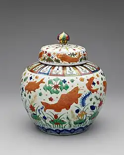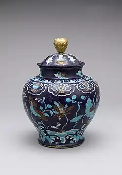 Dzban na wodę w kolorach wucai i wytłaczany złotem (jap. kinrande). Era Jiajing. Muzeum Narodowe w Tokio