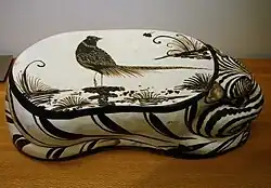 - Ceramiczna poduszka z czerwono–zieloną dekoracją w formie Mandarynek na powierzchni stawu. Cizhou, 1150–1234. Art Institute of Chicago