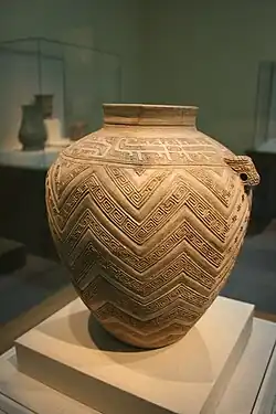 Naczynie (poddane rekonstrukcji) z jaskini Xianren w prowincji Jiangxi, skąd pochodzą najstarsze znane fragmenty ceramiki użytkowej, datowane na 18 do 17 tys. lat p.n.e.[9] Chińskie Muzeum Narodowe- Naczynie ze stanowiska Miaodigou. Kultura Yangshao, ok. 4000 p.n.e. Muzeum Shanxi