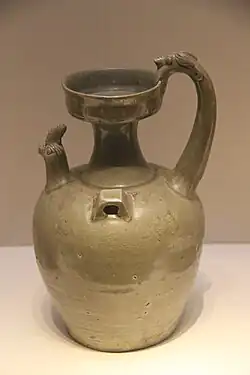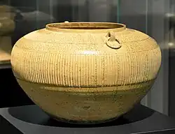 Dzban typu Hu z nakładaną i rytą dekoracją, pokryty niejednolitym szkliwem celadonowym. Wczesna ceramika z Yue, ok. 100 p.n.e. – 100 n.e. Los Angeles County Museum of Art