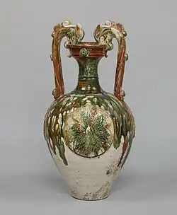 Za czasów dynastii Han pojawiły się również naczynia z glazurą ołowiową. Chińczycy zdawali sobie sprawę, że ołów jest trujący, stąd tego rodzaju szkliwo było używane jedynie do ceramiki grobowej. Kształty naczyń naśladowały rytualne brązy albo miały postać dzbanów z wielkimi brzuścami, ale część z nich posiadała również wykonywaną za pomocą formy dekorację przedstawiającą sceny polowania lub nieśmiertelnych wędrujących w górach lub posród chmur (zobacz ilustracja). Glazura ołowiowa była stosowana do ceramiki wypalanej w niskiej temperaturze, nie wymagała bowiem wysokiej temperatury. Wypalanie w atmosferze utleniającej dawało kolor brązowy, albo zielony, jeśli dodano tlenek miedzi. Ten drugi kolor był bardzo popularny w okresie Późniejszej dynastii Han (25–220). Oprócz naczyń, w późniejszym okresie glazurą ołowiową zaczęto pokrywać również figurki[20].