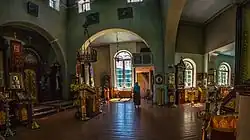 Wejście do cerkwi prowadzi przez przedsionek, nad którym wznosi się trójkondygnacyjna wieża-dzwonnica z dachem malowanym na zielono i złoconą kopułą. Nawa świątyni zbudowana jest na planie prostokąta, zwieńczona pięcioma kopułami zgrupowanymi wokół największej, centralnej. Całość otacza fryz. Z zewnątrz cerkiew malowana jest na biało i bogato dekorowana płaskorzeźbami, jej okna, ozdobnie obramowane, mają kształt półkolisty.