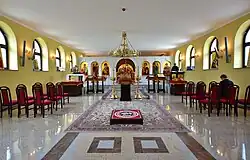 Wewnątrz znajduje się marmurowy ikonostas, w którym została umieszczona ikona św. męczennika Bazylego Martysza, patrona użytkowanej wcześniej przez parafię kaplicy[2].