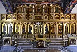 We wnętrzu znajduje się współczesny trzyrzędowy ikonostas.