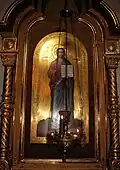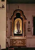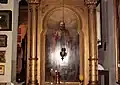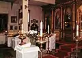 W części za ikonostasem znajduje się ołtarz z tronem bożym, za którym stoi siedmioramienny świecznik oraz witraż przedstawiający Zmartwychwstałego Chrystusa. Na prawo od ołtarza znajduje się ikona św. Mikołaja (patrona cerkwi) i św. Michała.