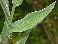 - Naprzemianległe. Blaszka liściowa jest ząbkowana z ostrym wierzchołkiem. Liście górne nasadą obejmują łodygę[8].