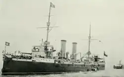 - 1 2 Uzbrojenie w 16 dział kalibru 57 mm i jedno 37 mm podaje Patianin 2007 ↓, s. 284. Najpowszechniejsza wersja o uzbrojeniu w 12 dział Armstrong kalibru 76 mm (12-funtowych) i sześć 47 mm (3- lub 2½-funtowych), przytoczona w roczniku Jane’s Fighting Ships 1905/6 ↓, s. 355 i dalszych opracowaniach, nie znajduje potwierdzenia na fotografii okrętu, na której wyraźnie widać, że wszystkie działa są mniejszego kalibru systemu Hotchkissa – prawdopodobnie 57 mm (zdjęcie działa). Podobne były nieco mniejsze działa kalibru 47 mm. Informację o uzbrojeniu w 16 dział kalibru 47 mm (opisanego jako 1,8 cala), jedno lekkie działko i dwa karabiny maszynowe podaje almanach Brassey 1905 ↓, s. 259 oraz wspomina o takiej wersji (16 dział 3-funtowych) Sobański 2016 ↓, s. 39.