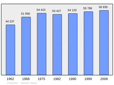 Według danych na rok 1990 gminę zamieszkiwało 54 120 osób, a gęstość zaludnienia wynosiła 2578 osób/km² (wśród 2880 gmin regionu Rodan-Alpy Chambéry plasuje się na 7. miejscu pod względem liczby ludności, natomiast pod względem powierzchni na miejscu 461.).