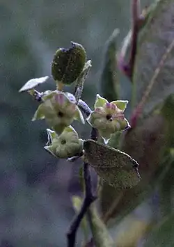 - Ulistnienie skrętoległe, liście eliptyczne lub podługowate, ostro zakończone, drobno ząbkowane, podobne kształtem do liści wierzby kruchej. Mają szerokość 5–15 mm i na spodniej stronie pokryte są brązowymi łuskami. Są skórzaste i zimozielone.