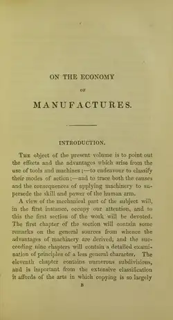 Babbage zajmował się m.in. organizacją pracy w fabrykach. Można mówić o dwóch zasadniczych projektach, nad którymi pracował i których idee w późniejszym okresie miały wpływ na informatykę. Był przekonany, że zastosowanie nauk ścisłych do procesów pracy jednocześnie zwiększyłoby ich wydajność i obniżyło koszty. Uważał, że każda operacja przemysłowa powinna być analizowana dla wyodrębnienia różnych zaangażowanych w niej umiejętności. Następnie należałoby wyszkolić robotnika w określonej czynności i powierzyć mu odpowiedzialność tylko za tę czynność całej operacji, ale nie za całość zadania. W ten sposób można by ograniczyć kosztowne szkolenie, a ciągłe powtarzanie czynności zwiększałoby wprawę i wydajność robotników.