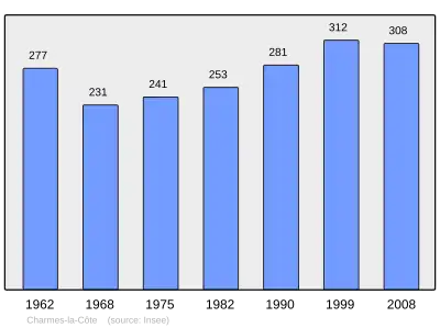 Według danych na rok 1990 gminę zamieszkiwało 281 osób, a gęstość zaludnienia wynosiła 45 osób/km² (wśród 2335 gmin Lotaryngii Charmes-la-Côte plasuje się na 768. miejscu pod względem liczby ludności, natomiast pod względem powierzchni na miejscu 901.).
