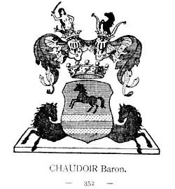 Herb został przyniesiony z Francji do Bawarii, gdzie czynny w Warszawie kupiec[3] Jean-Joseph Chaudoir otrzymał od króla bawarskiego, Maksymiliana I, tytuł barona. W Królestwie Polskim Jan-Józef został przypuszczony do szlachectwa 29 listopada 1819 roku, natomiast jego syn Stanisław – 22 lutego 1820 roku. W roku 1827 otrzymali potwierdzenie tytułu baronów[2].