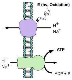 Protony są przenoszone przez wewnętrzną błonę mitochondrialną przy udziale trzech kompleksów przenośników elektronów, które uczestniczą w poszczególnych etapach transportu elektronów. Różnica w stężeniu protonów (H+) między matriks mitochondrium a przestrzenią miedzybłonową stanowi energię potencjalną (podobnie jak woda spiętrzona w zaporze).