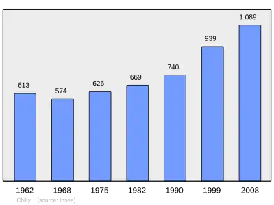 Według danych na rok 1990 gminę zamieszkiwało 740 osób, a gęstość zaludnienia wynosiła 40 osób/km² (wśród 2880 gmin regionu Rodan-Alpy Chilly plasuje się na 952. miejscu pod względem liczby ludności, natomiast pod względem powierzchni na miejscu 566.).