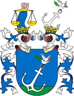 W polu błękitnym, na murawie, kotwica srebrna, na niej gołąb biały z gałązką oliwną w dziobie. Nad tarczą dwa hełmy ukoronowane, na pierwszym ręka w błękitnym rękawie trzyma wagi złote, na drugim kotwica i gołąb, jak na tarczy. Labry błękitne, podbite srebrem.