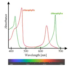 Widmo absorpcyjne chlorofilu a sięga od fal o długości poniżej 400 nm do około 700 nm, przy czym pomiędzy 480 nm a 550 nm ma minimum – co sprawia, że ma on zieloną barwę, a maksima ma przy falach o długości 430 nm i 662 nm, czyli nieco szerzej niż u chlorofilu b, który ma maksima przy falach o długości 453 nm i 642 nm[4]. In vivo sytuacja jest bardziej złożona, a maksima są przesunięte o 10-20 nm w stronę dłuższych fal. U różnych glonów maksimum może przypadać na fale o długości od 660 do 705 nm. Może mieć to związek z agregowaniem się cząsteczek chlorofilu a i wiązaniem z białkami. W tej samej komórce mogą występować formy chlorofilu a, z których jedna ma maksimum absorpcji przy 640 nm, a druga przy 650 nm, mimo braku zauważalnych różnic w budowie[3].