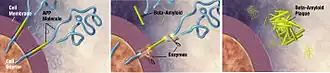 Chorobę Alzheimera zaliczono do chorób spowodowanych nieprawidłowościami białkowymi, dokładniej nieprawidłowym fałdowaniem łańcucha białkowego. Powoduje ją bowiem akumulacja nieprawidłowo sfałdowanego białka amyloidu beta i tau w mózgu[76]. Płytki składają się z niewielkich peptydów liczących od 39 do 43 reszt aminokwasowych, nazywanych Aβ (amyloid beta). Stanowią one fragmenty większych białek zwanych APP (prekursorowe białko amyloidu). APP to białko przezbłonowe, penetrujące aksolemmę. Białko to pełni krytyczną rolę we wzroście neuronu, jego przeżyciu, jak i naprawie po uszkodzeniu[77][78]. W chorobie Alzheimera nieznany bliżej proces powoduje podział APP na mniejsze fragmenty przez enzymy (proteoliza)[79]. Jeden z powstałych tak fragmentów daje początek włóknom amyloidowym tworzącym skupiska odkładające się na zewnątrz neuronów w gęstych tworach zwanych płytkami starczymi[11][75]