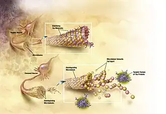Chorobę Alzheimera uznaje się również za tauopatię z powodu nieprawidłowej agregacji białka tau. Każdy neuron posiada cytoszkielet, wewnętrzne rusztowanie komórki tworzone częściowo przez mikrotubule. Uczestniczą one w transporcie substancji, w tym substancji odżywczych, z perykarionu wzdłuż aksonu do jego końca i w kierunku odwrotnym. Białko tau stabilizuje mikrotubule, gdy ulegnie fosforylacji, tworząc wtedy białko związane z mikrotubulami (MAP, od ang. microtubule-associated protein). W chorobie Alzheimera rzeczone białko przechodzi modyfikacje chemiczne, podlega hiperfosforylacji. Zyskuje wtedy zdolność łączenia się z innymi łańcuchami, tworząc splątki neurofibrylarne i dezintegrując układ transportujący w neuronie[80].