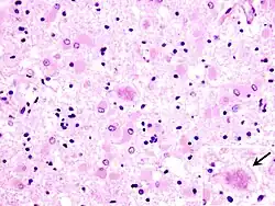 ![]() Zmiany gąbczaste w obrazie mikroskopowym mózgu pacjenta z CJD | |