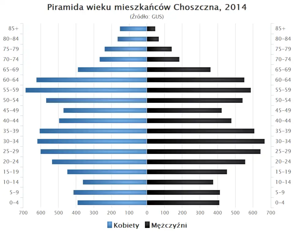 - Piramida wieku mieszkańców Choszczna w 2014 roku[21].