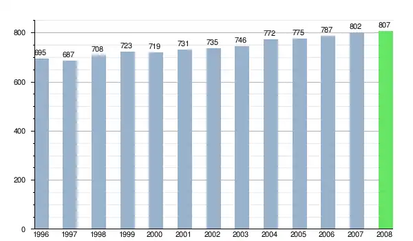 31 grudnia 2012, wieś zamieszkiwały 862 osoby, w tym 395 kobiet i 467 mężczyzn[6].