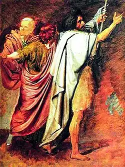 Na obrazie przedstawiona została scena z Nowego Testamentu: św. Jan Chrzciciel nad wodami Jordanu głoszący chrzest nawrócenia i pokuty[4]. Poprzednik Pański proponował Żydom swoich czasów symboliczny gest zanurzenia, który miał być wyrazem gotowości i wezwania, by Bóg wypełnił w historii to, co zostało zapowiedziane przez starotestamentalnych proroków[5]. Był to również gest wyrażający pokorne uznanie, że o własnych siłach nie jest się w stanie człowiek sam zbawić. Tradycja ewangeliczna nazwała Jana „głosem, który woła na puszczy”. Działalność Jana miała być wypełnieniem starotestamentalnego proroctwa Izajasza, który wzywał do przygotowania „drogi dla Pana na pustyni”[6]. Jan Chrzciciel miał się jednak zorientować, iż wiele osób przystępowało do tego rytu formalnie, bez zaangażowania wewnętrznego. Zaczął im to gorzko wypominać. Według Jana, żadna kąpiel nie pomoże, trzeba rzeczywistego nawrócenia, by okazać się gotowymi na wypełnienie się czasu. Potrzeba prawdziwego otwarcia się na Bożą interwencję w czasie. Jak podaje ewangelista Mateusz, Jan był świadomy, iż mający się wkrótce objawić Jezus, jest mocniejszy i potężniejszy od niego: „Ma On wiejadło w ręku i oczyści swój omłot (...) plewy spali w ogniu nieugaszonym”[7]. Mesjasz miał odseparować sprawiedliwych od niesprawiedliwych.