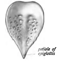 U człowieka ma kształt sercowaty[4], esowato wygięty[5], porównywany do liścia[3], łyżki do butów[6], cedzaczka[7], pióra[8] lub siodełka roweru[5]. Jest zbudowana z tkanki chrzęstnej sprężystej i włóknistej[9][5][8]. Razem z gruczołami śluzowo-surowiczymi i błoną śluzową, którymi jest pokryta, tworzy nagłośnię, której górna część stanowi przednio-górne ograniczenie krtani[3][5][10]. Wyróżnia się w niej dwie części – górną płytkę (lamina), szeroką, grubszą w środkowej części a cieńszą na wywijających się w stronę językową brzegach, i dolną, silnie zwężającą się szypułkę (petiola)[7][5][9]. Powierzchnia przednia chrząstki nagłośniowej, skierowana w stronę języka (powierzchnia językowa), jest nieco wypukła, a powierzchnia tylna (krtaniowa) – wklęsła[7][5]. Chrząstka poprzebijana jest otworami dla przejścia naczyń krwionośnych, przewodów gruczołów i nerwów. Na obu powierzchniach znajdują się też zagłębienia dla gruczołów, więcej jest ich na powierzchni tylnej[5]. Większa część (część podgnykowa) chrząstki położona jest z tyłu za kością gnykową i poniżej niej, mniejsza część (część nadgnykowa) – powyżej tej kości, z tyłu od nasady języka[5][3].