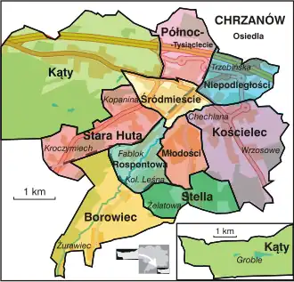 Kąty, Stara Huta, Borowiec i Kościelec stanowią typowo willowe części miasta, w pozostałych osiedlach dominuje budownictwo wielorodzinne. W gminie Chrzanów poza wymienionymi jednostkami funkcjonuje także sześć sołectw[19]: Balin, Luszowice, Okradziejówka, Płaza, Pogorzyce i Źrebce.