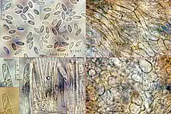 Worki 8-zarodnikowe, o wymiarach 4,5 × 65 µm, Parafizy wąskie, nitkowate lub lekko maczugowate, wyrastające poza worki. Zarodniki elipsoidalne, gładkie, 6–10 × 2,5–4 µm, szkliste, w stanie dojrzałym z dwoma ciemnymi gutulami[3].
