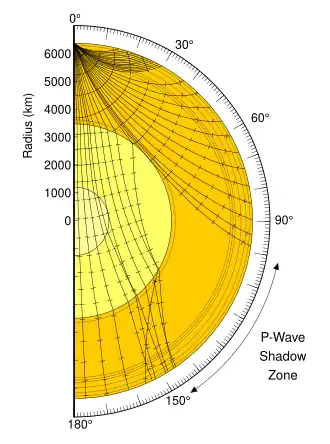 Strefa cienia fali P natomiast rozciąga się od 103. do 143. stopnia i fale te są rejestrowane po przeciwnej stronie Ziemi. Jądro zewnętrzne powoduje silne ugięcie fali, ale może się ona w nim rozchodzić. Dodatkowo w obszarze cienia, powyżej 103° obserwuje się słabsze fale podłużne, które uległy dyfrakcji na granicy jądra i płaszcza.