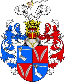 Na tarczy czterodzielnej, w polach I i IV błękitnych – ręka zbrojna z mieczem, w II i III czerwonym – po dwa pióra. W klejnocie ramię zbrojne pomiędzy piórami strusimi.