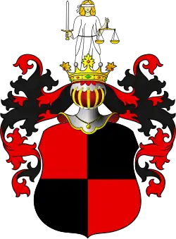 Tarcza skwadrowana, pola I i III czerwone, II i IV, czarne. Klejnot: nad hełmem w koronie postać Temidy z mieczem w prawicy i wagą w lewicy, z przewiązanymi oczyma, w szacie szarej. Labry czerwone, podbite czernią.