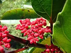 - Niepozorne, zebrane w czerwono-purpurowych, baldachokształtnych kwiatostanach. Same kwiaty szerokości 1,5 mm i długości do 4 mm, z wywiniętymi, drobnymi płatkami[6].