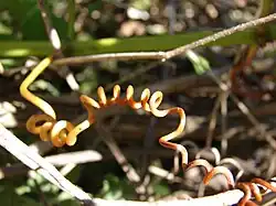 - Pędy smukłe, gładkie i silne. Wytwarzają typowe dla rodziny winoroślowatych wąsy czepne, wspomagające proces wspinania się rośliny po podporach[4].