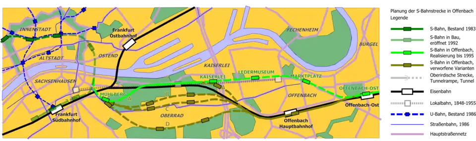 Jesienią roku 1983 miasto Offenbach am Main nakazało przeanalizować koszty budowy różnych wariantów trasy S-Bahn. Mimo większych nakładów finansowych, podjęto decyzję o budowie tunelu prowadzącego przez centrum miasta, sugerując, że korzyści z takiego przebiegu trasy są wyższe, niż (roz)budowa innych naziemnych tras na terenie miasta.