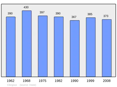 Według danych na rok 1990 gminę zamieszkiwało 367 osób, a gęstość zaludnienia wynosiła 23 osoby/km² (wśród 747 gmin Limousin Clergoux plasuje się na 312. miejscu pod względem liczby ludności, natomiast pod względem powierzchni na miejscu 418.).