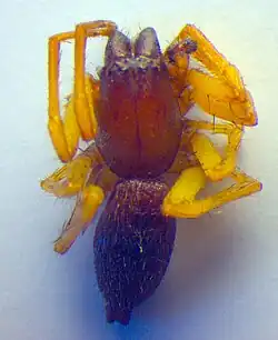 Samce osiągają od 4 do 6 mm[2], a samice od 4,4[3] do 7 mm długości ciała[2]. Karapaks zmierzony u 9 samców miał od 1,94 do 2,4 mm długości i od 1,35 do 1,67 mm szerokości, zaś u 12 samic od 2,01 do 2,47 mm długości i od 1,35 do 1,73 mm szerokości[3]. Ubarwienie karapaksu jest rudobrązowe lub brązowawe z brzegiem ciemnobrązowym do czarniawego. Szczękoczułki są ciemnobrązowe do czarnych[2][3], zaopatrzone w 4 zęby na przedniej i 2 na tylnej krawędzi. Sternum ma kolor brązowawy u samca i żółtawobrązowy u samicy[3]. Odnóża są żółte[2] lub jasnożółtawobrązowe. Kolejność par odnóży od najdłuższej do najkrótszej przedstawia się następująco: IV, II, I, III[3]. Opistosoma (odwłok) ma wierzch jasnobrązowy do rudobrązowego[2][3], u samca z jaśniejszymi kropkami na przedzie, a u samicy niekiedy z niewyraźnym znakiem pośrodku części przedniej oraz niewyraźnymi szewronami w części tylnej. Spód opistosomy jest jasnożółtawobrązowy do jasnobrązowego[3].