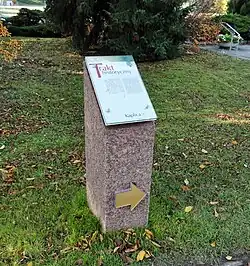 Tablice informacyjne ścieżki botanicznej: 1. Tablica główna, 2. Cis pospolity, 3. Bukszpan wieczniezielony, 4. Platan klonolistny, 5. Grab pospolity, 6. Jodła nikko, 7. Sosna himalajska, 8. Ostrokrzew kolczasty, 9. Buk pospolity, 10. Daglezja zielona (jedlica), 11. Lipa krymska, 12. Bluszcz pospolity, 13. Choina kanadyjska, 14. Sosna wejmutka, 15 Miłorząb dwuklapowy, 16. Dąb zimozielony, 17. Chmielograb europejski, 18. Sosna limba, 19. Modrzew europejski, 20. Świerk serbski ‘Pendula’, 21. Jałowiec pośredni (J. Pfitzera), 22. Dąb szypułkowy f. stożkowata, 23. Jodła, 24. Jodła jednobarwna (kalifornijska) odmiana sina, 25. Jodła koreańska, 26. Świerk kłujący f. sina, 27. Różanecznik katawbijski (fioletowy), 28. Buk pospolity odmiana zwisająca, 29. Buk pospolity odmiana ‘Purpurea Tricolor’, 30. Świerk pospolity odmiana nibywiciowa, 31. Cyprysik Lawsona, 32. Dąb czerwony, 33 Złotokap pospolity.