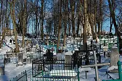 Do nekropolii prowadzi bogato zdobiona brama z okresu klasycyzmu zbudowana w 1830 przez Jerzego Kobylińskiego (na pamiątkę zmarłej żony). Na cmentarzu znajduje się neogotycki kościół Podwyższenia Krzyża Świętego (1839–1841). We wnętrzu świątyni pochowano m.in. Jana Krzysztofa Damela – polskiego malarza i grafika, wykładowcę Uniwersytetu Wileńskiego.