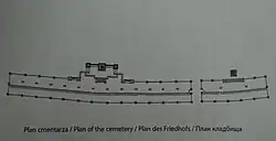 Projektantem był Anton Müller (spotyka się w niektórych opracowaniach błędną informację, że był to Jan Szczepkowski[5]). Cmentarz składa się z dwóch wydłużonych kwater; dolnej większej i górnej mniejszej. Taki układ wynika z faktu, że w ten sposób pochowani zostali żołnierze przez swoich kolegów, a projektant dostosował wygląd cmentarza do zastanych faktów. Tylne boki obydwu kwater przylegają do lasu. Łączna długość cmentarza wynosi 90 m. Na obydwu kwaterach znajdują się podobne pomniki centralne. Są to duże betonowe krzyże łacińskie osadzone na murowanych z kamienia cokołach. Po obydwu stronach krzyża na dolnej kwaterze są ponadto ławy pomnikowe. Ogrodzenie stanowią murowane z kamienia słupki nakryte betonowymi daszkami i połączone stalowymi rurami. Wejście przez kute, metalowe furtki pomiędzy kamiennymi słupkami[4]. Na polu cmentarnym są 2 mogiły zbiorowe i 5 pojedynczych. Ustawiono na nich kilka betonowych steli z nazwiskami poległych.