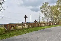 Pierwotnie ogrodzenie cmentarza tworzył drewniany płot segmentowy. Wchodziło się na cmentarz przez dwie trójkątnie zwieńczone bramki. Płot jednak z czasem zbutwiał. Później na cmentarz prowadziło tylko jedno wejście przez bramę wykonaną z metalowych prętów. Na bramie umieszczono datę 1914. Płot zastąpiono żywopłotem. Oryginalny drewniany krzyż ze stylizowaną, geometryczną glorią, podobnie jak płot zbutwiał z czasem. Zastąpił go mniejszy krzyż bez glorii[4].