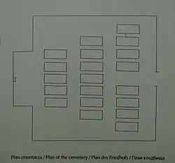 Mogiły poległych żołnierzy rozmieszczono w trzech rzędach. Nagrobki to betonowe stele. Nagrobki żołnierzy rosyjskich wieńczy żeliwny dwuramienny krzyż, na stelach zamontowano białe blaszane tabliczki z napisem „1 RUSS.[5] KRIEGER". Trzy mogiły żołnierzy austro-węgierskich znajdują się w centrum środkowego rzędu, odróżniają się od rosyjskich wyższym, jednoramiennym krzyżem z imienną inskrypcją.