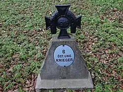 Zaprojektowany został przez Heinricha Scholza na planie prostokąta. Ogrodzenie tworzą murowane z kamienia słupki, między którymi zawieszono drewniany płot segmentowy typu balustrada. Wejście przez dwuskrzydłową drewniana bramę osadzoną na kamiennych słupkach, które zwieńczone są rzeźbami przedstawiającymi głowy w hełmach hoplity. Głównym elementem ozdobnym jest drewniany krzyż na kamiennym postumencie w kształcie piramidy. Od bramy prowadzi do niego ścieżka. Po jej obydwu stronach nagrobki żołnierzy ułożone w czterech rzędach. Są to betonowe stele zwieńczone żeliwnymi krzyżami z wieńcem laurowym i datą 1915. Są dwa rodzaje tych krzyży: jednoramienne krzyże maltańskie i dwuramienne krzyże lotaryńskie. Na stelach emaliowane tabliczki z nazwiskami poległych[1][3].