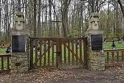 - ↑ Na podstawie tablic informacyjnych zamontowanych na słupkach bramy wejściowej cmentarza